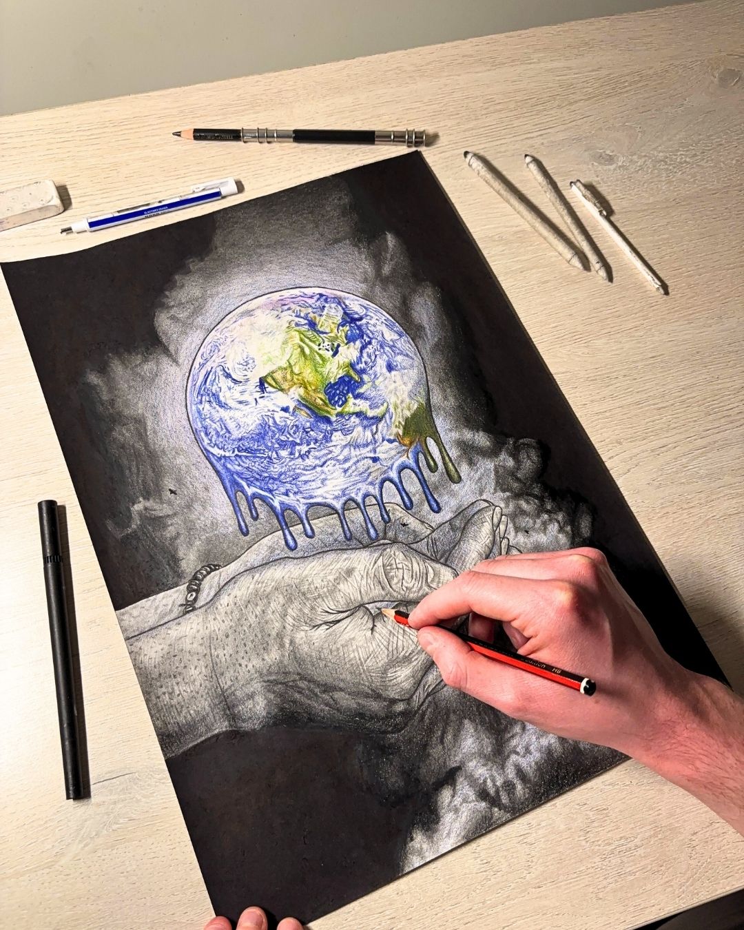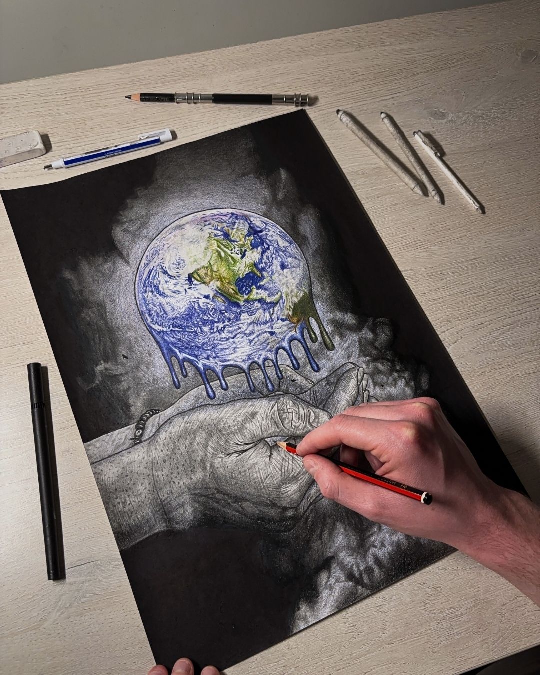 I primarily work with pen and pencil - using materials like HB pencils, colouring pencils, watercolour brush pens, and biro pens. My style blends elements of street art with realism, while being heavily influenced by hip-hop and urban culture. Each piece I draw takes an average of 25 hours to complete.
