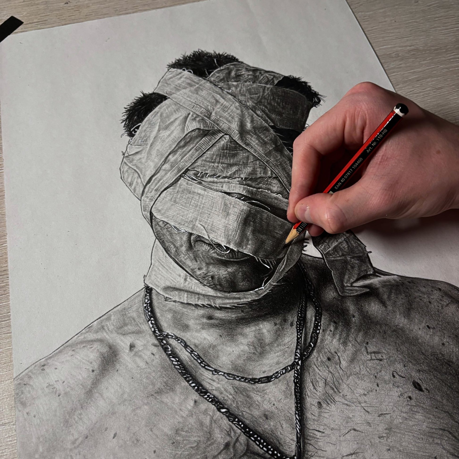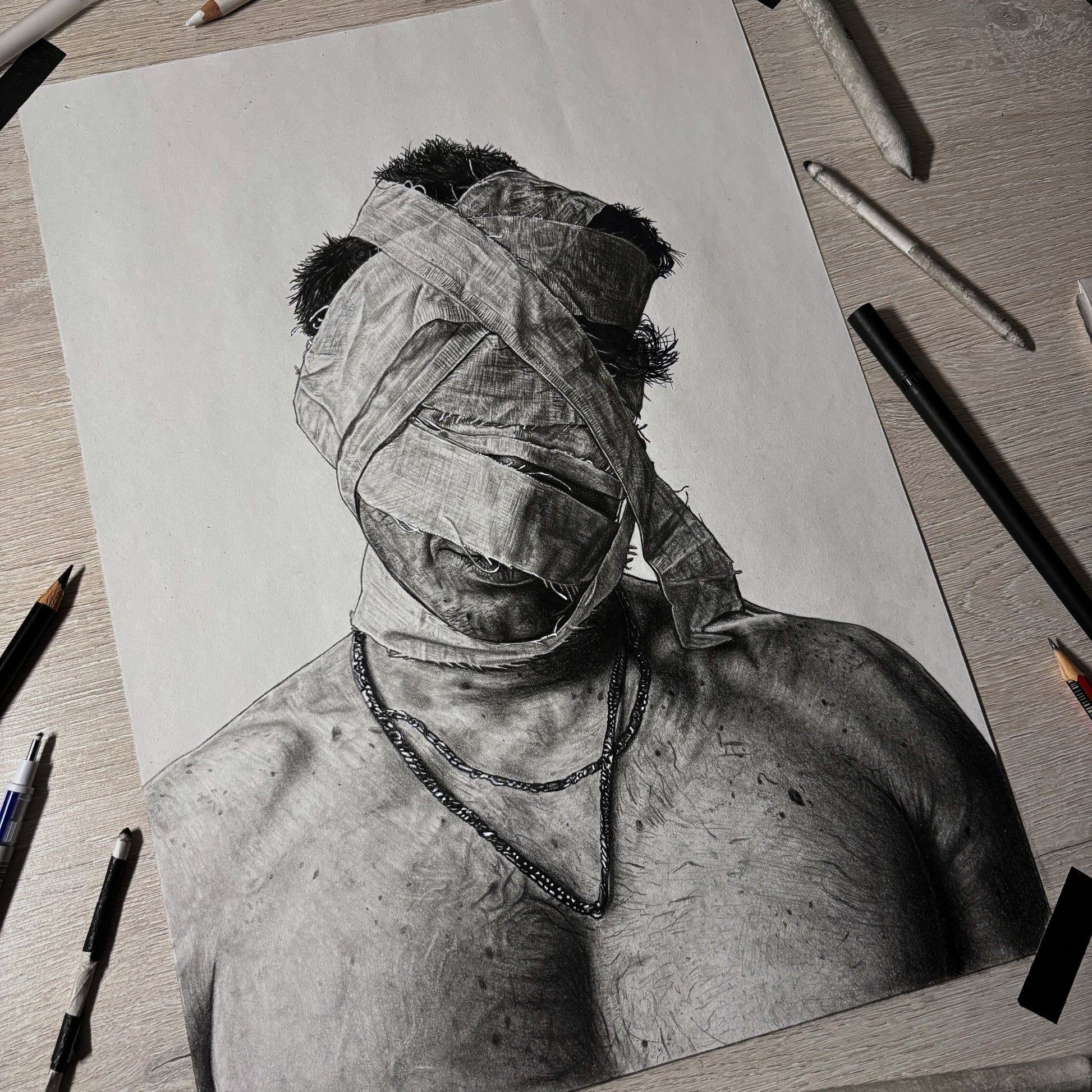 This print of the pen and pencil drawing, "Conditioned: Hardwired”, combines elements of street art with elements of hyperrealism. The artwork took around 25 hours to complete and includes a digital signature.