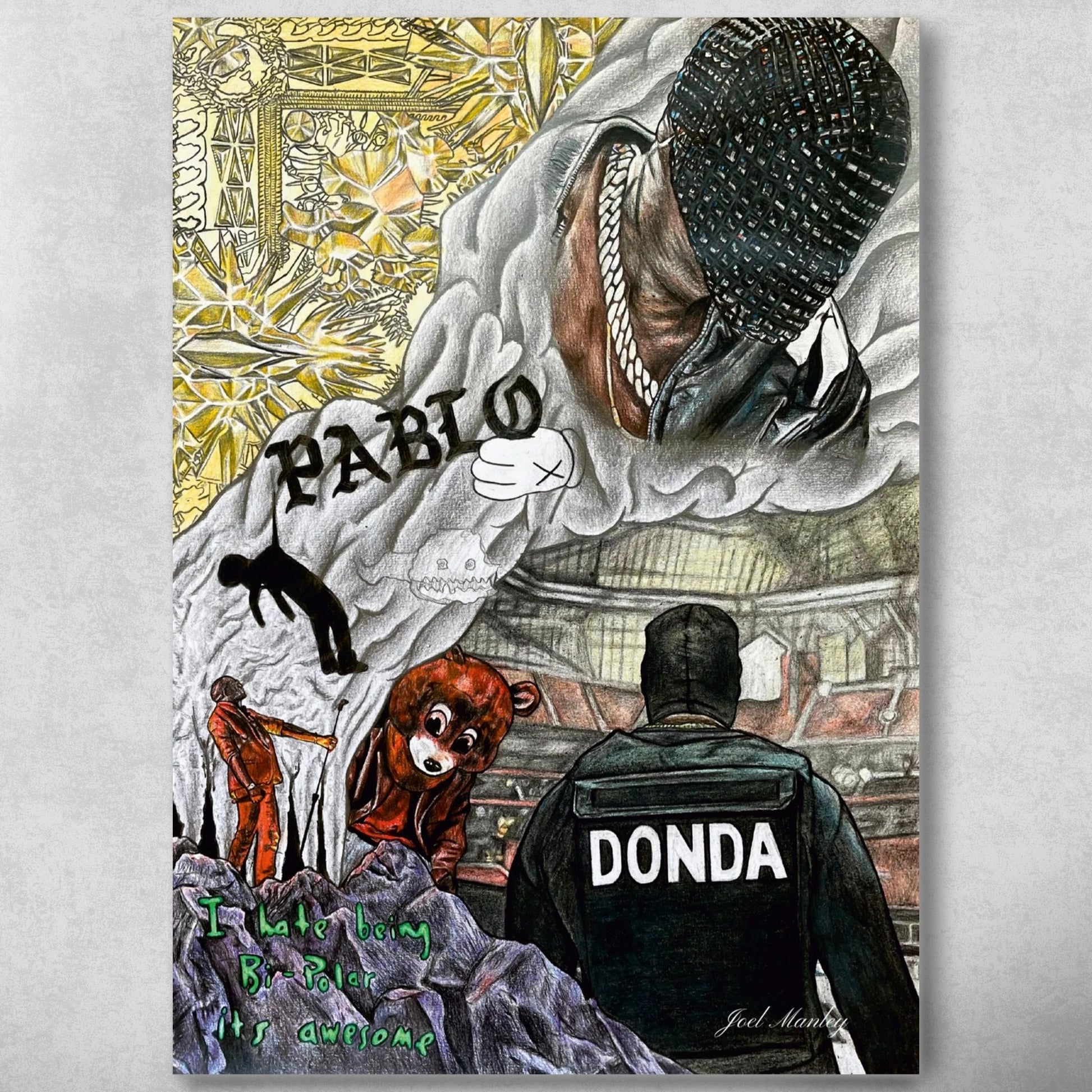 This print of the pencil drawing, "Kanye West", combines elements of street art with elements of hyperrealism. The artwork took around 25 hours to complete and it includes a digital signature.